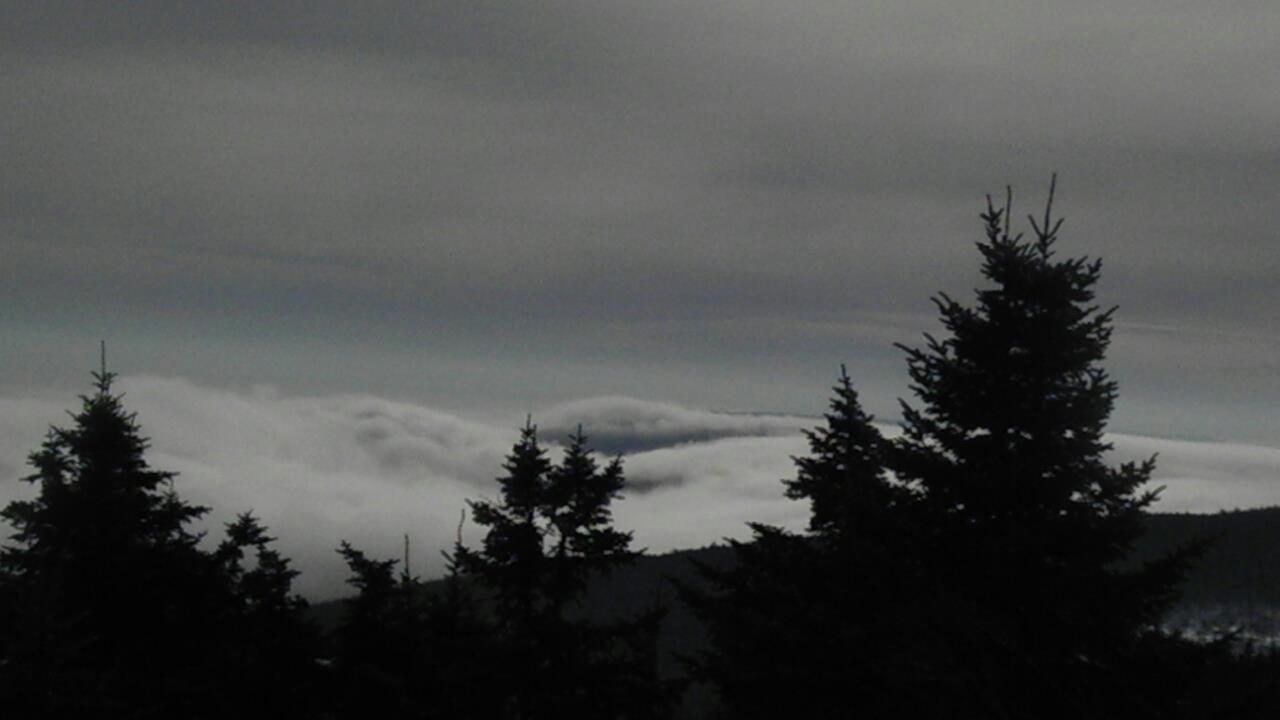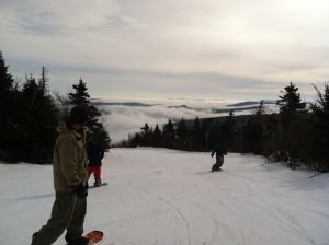 At 3,343 feet above sea level, Okemo has 2,198 feet of vertical drop. Apparently, the cloud couldn’t quite make the trek. Upon emerging from the cloud, a spectacular view was revealed. The distance was bathed in white, with subtle undulations where the clouds blanketed the tops of the lesser mountains surrounding us. The greater peaks emerged like majestic islands in a sea of white; the clouds battering their fortified shores.