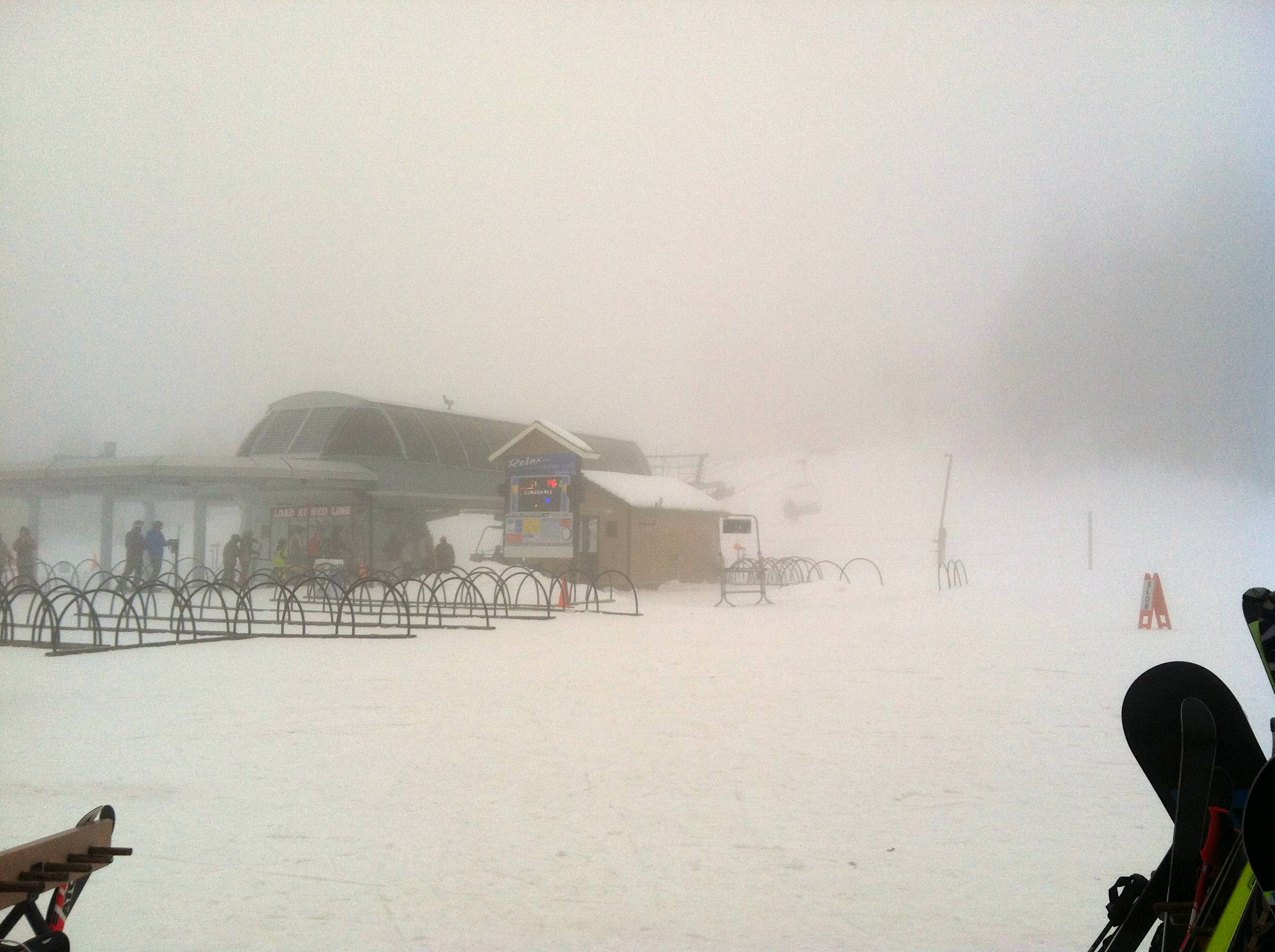 In the southern stretches of Vermont, first on our trip, Okemo welcomed us with open arms. We arrive at the mountain, among the first in line. The air is clear and the parking lot is still half empty. About three flights of stairs above the parking lot sits the base lodge lift, barely visible from the stairs of the base lodge itself. Overcast? More like under siege.