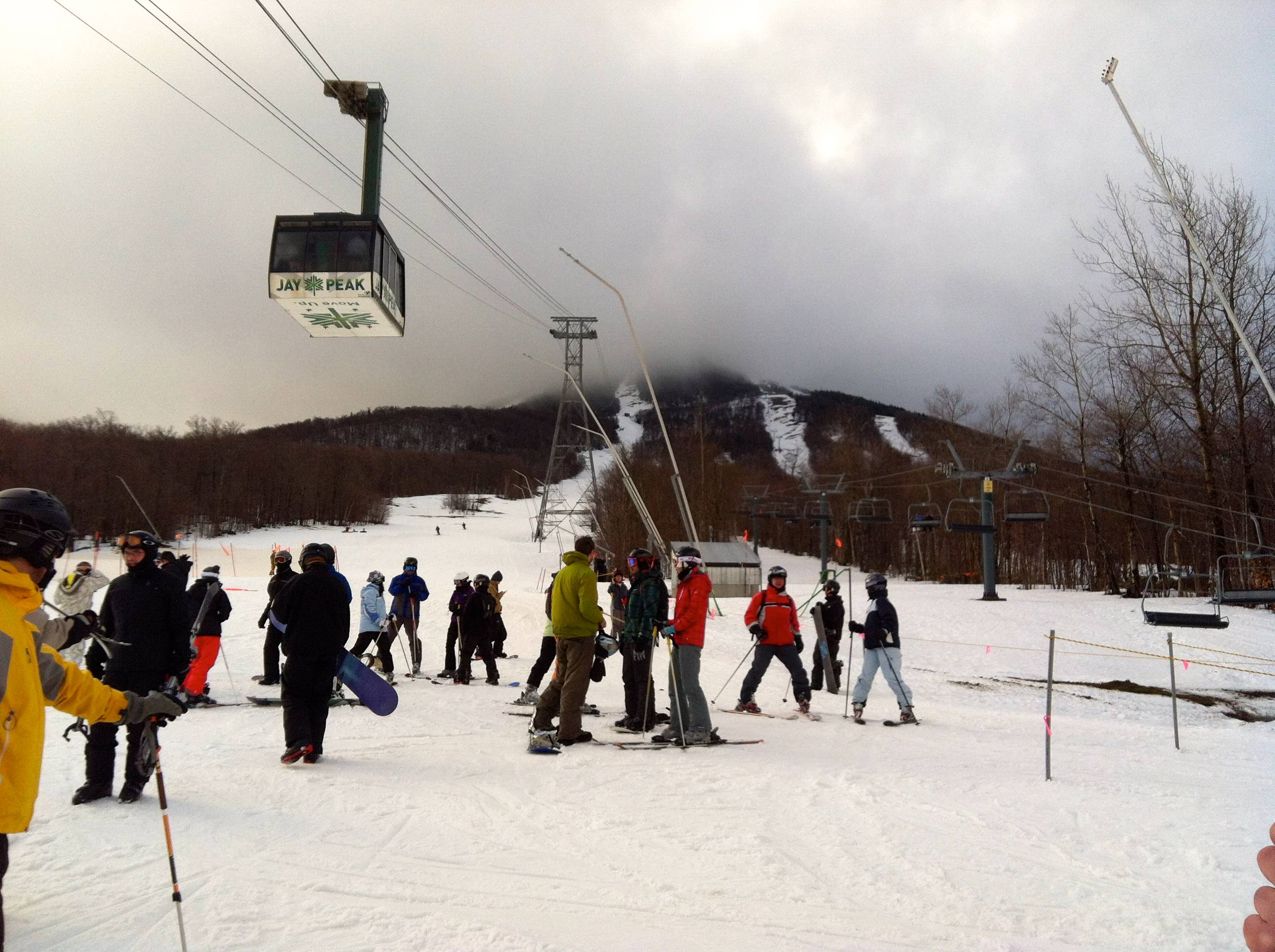 Location wasn’t the only polar opposite from Okemo to Jay Peak. Arriving at the lodge, we were greeted with ripping winds. This time, the overcast was entirely overhead, no such gifted breakthroughs would be given today. Still, we crammed aboard the Aerial Tram, with 60 other passengers (give or take) and headed to the peak.