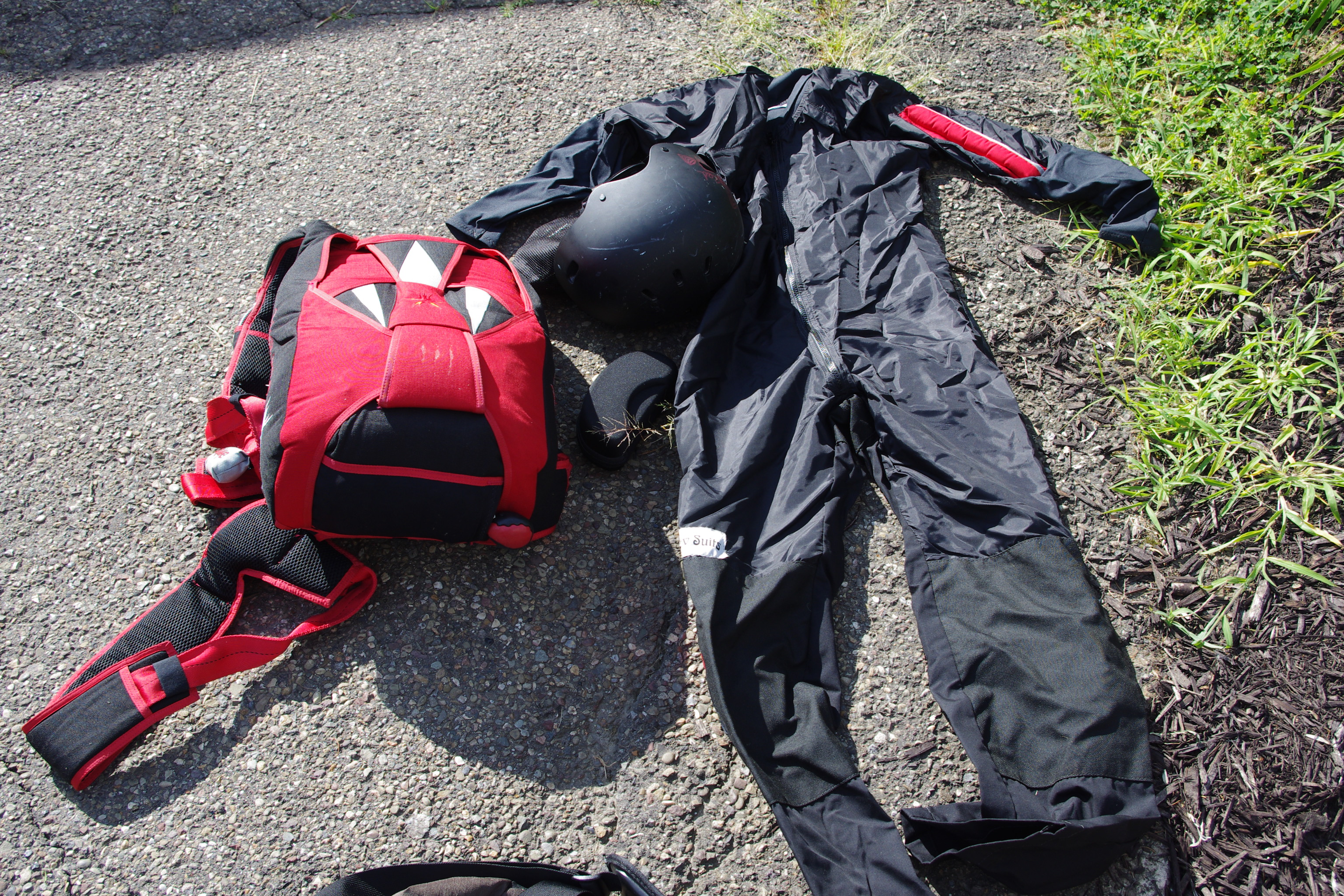 Skydiving equipment: Container/Parachute, Helmet, Kneepads, Altimeter, Log Book, Gloves and Jumpsuit. Stuffed in a big duffel bag.