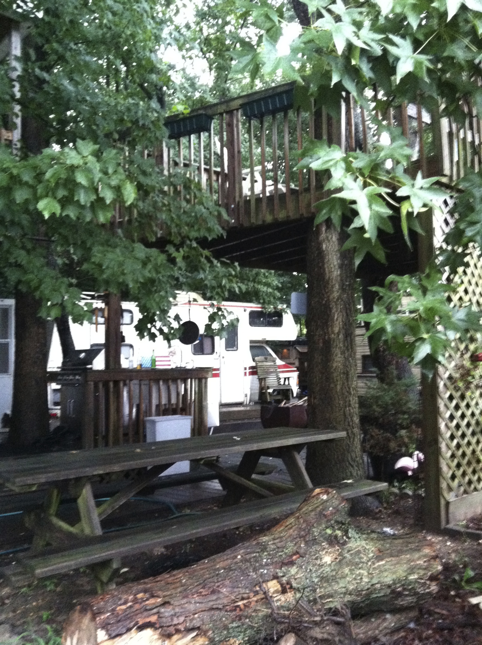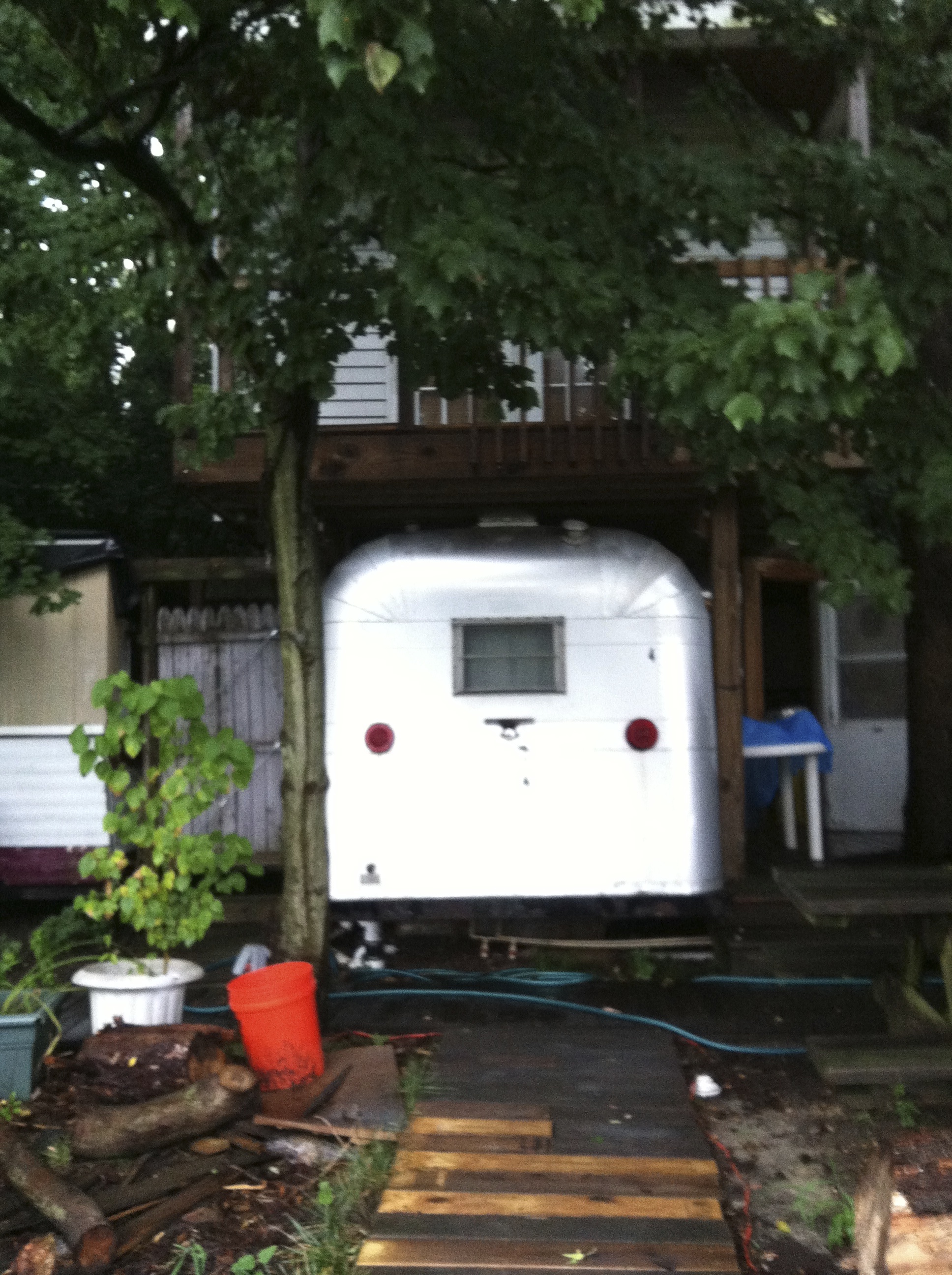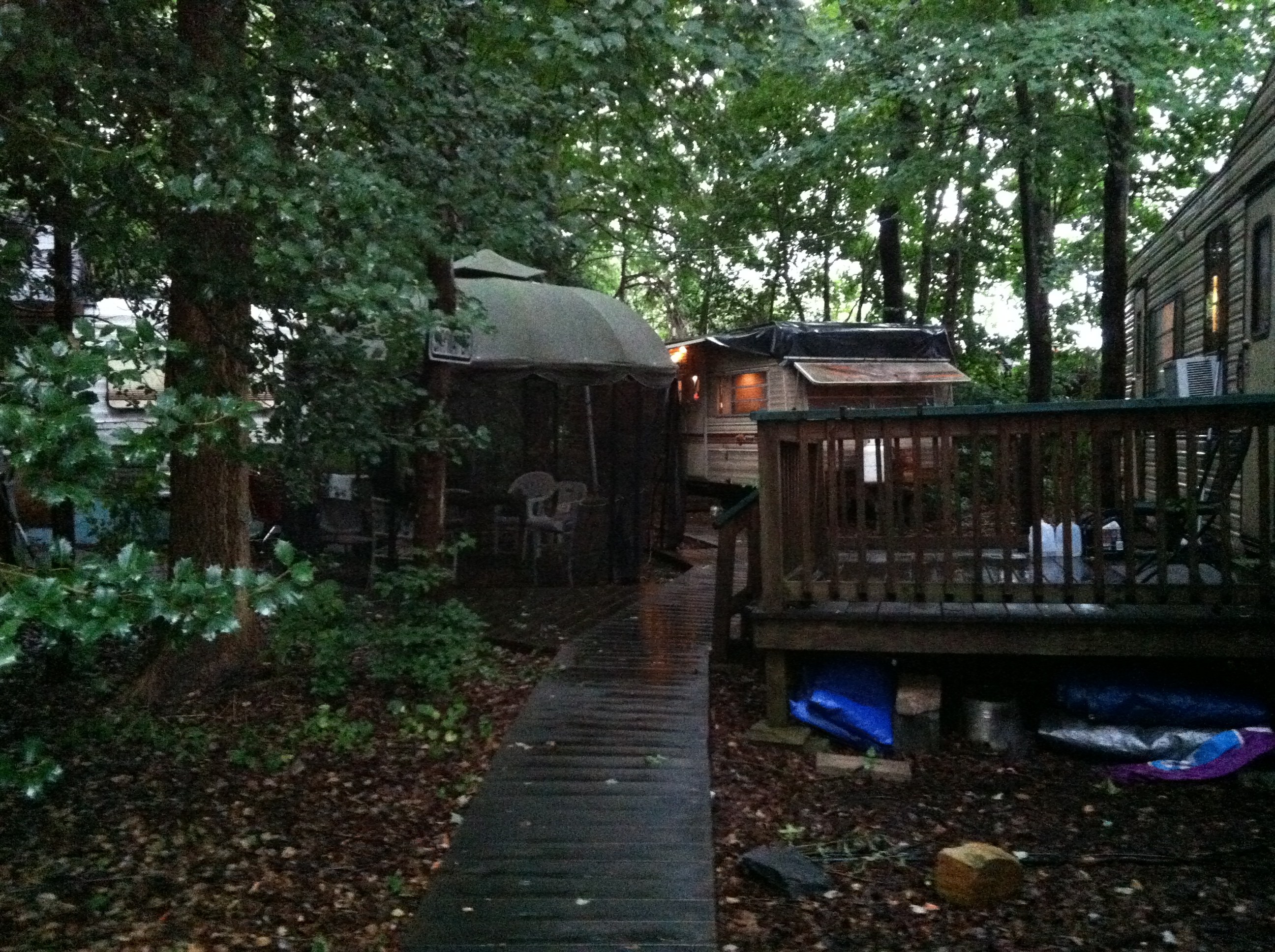 Of course just as I setting up, a steady rain picked up and got me SOAKED. I headed back to the tiki bar to warm up with a beer and watch the lightning in the distance. After the hammock was all set up, I was informed that the silver streamliner in the picture above was open for me to sleep in. Since the rain was expected to be off and on all night, I decided to take that option.