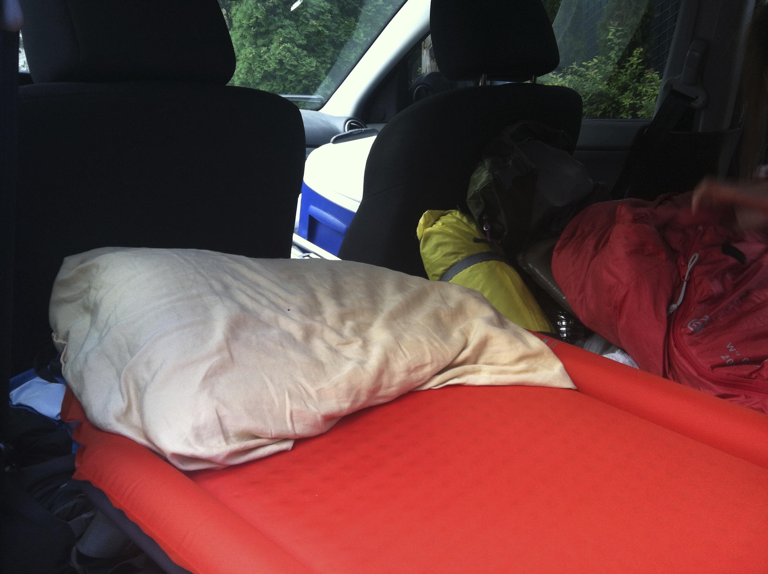 3. Let’s get comfy. A sleeping bag and camp bed will take your car from stiff and bumpy to Hilton comfy! A decent self inflating mattress packs down nicely and makes a world of a difference. Budget alternative: layer a quilt or blanket.