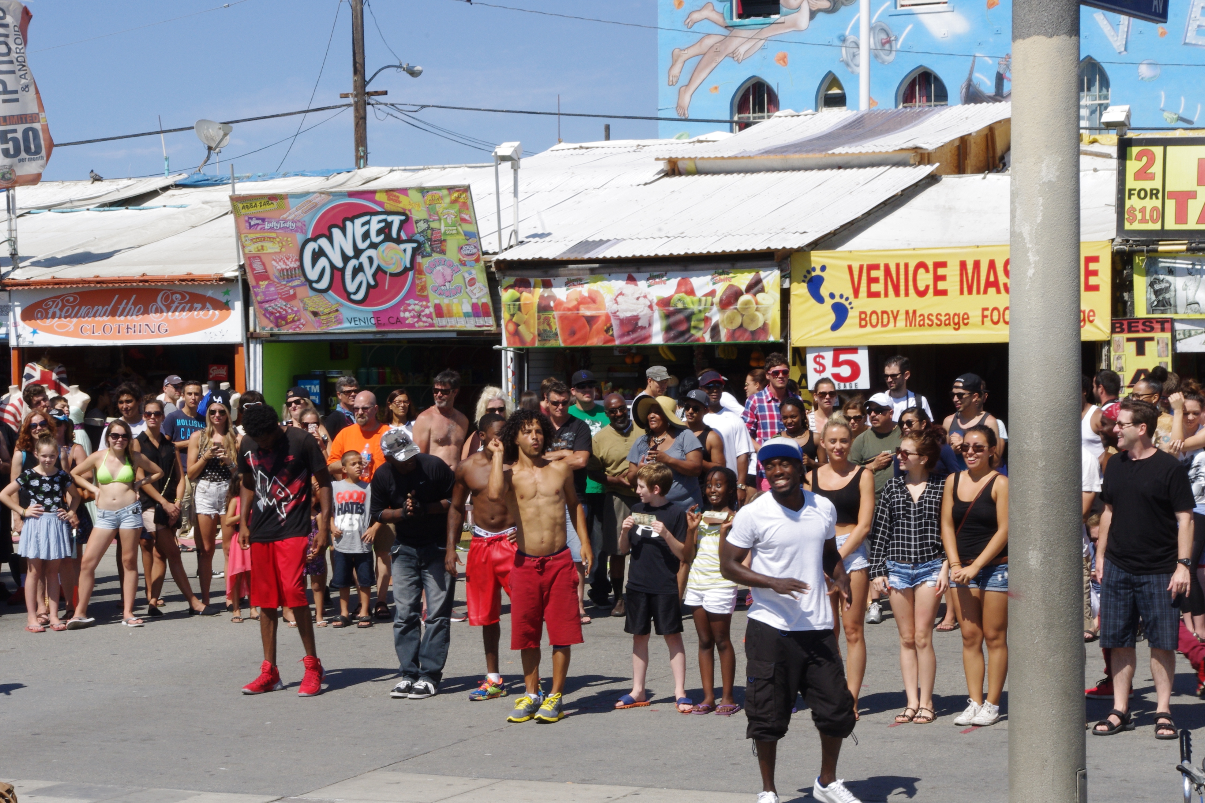 We made our way to Venice and walked through the canals to make our way out to the beach.  Walking along the board walk, a host of street performers did their thing.  One group was especially good at drawing a crowd, getting onlookers involved in a little dance-off which was hysterical to watch.