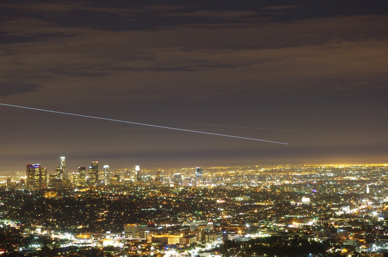 Planes flying in to the airport streak across the night sky as the haze rises up in the distance.