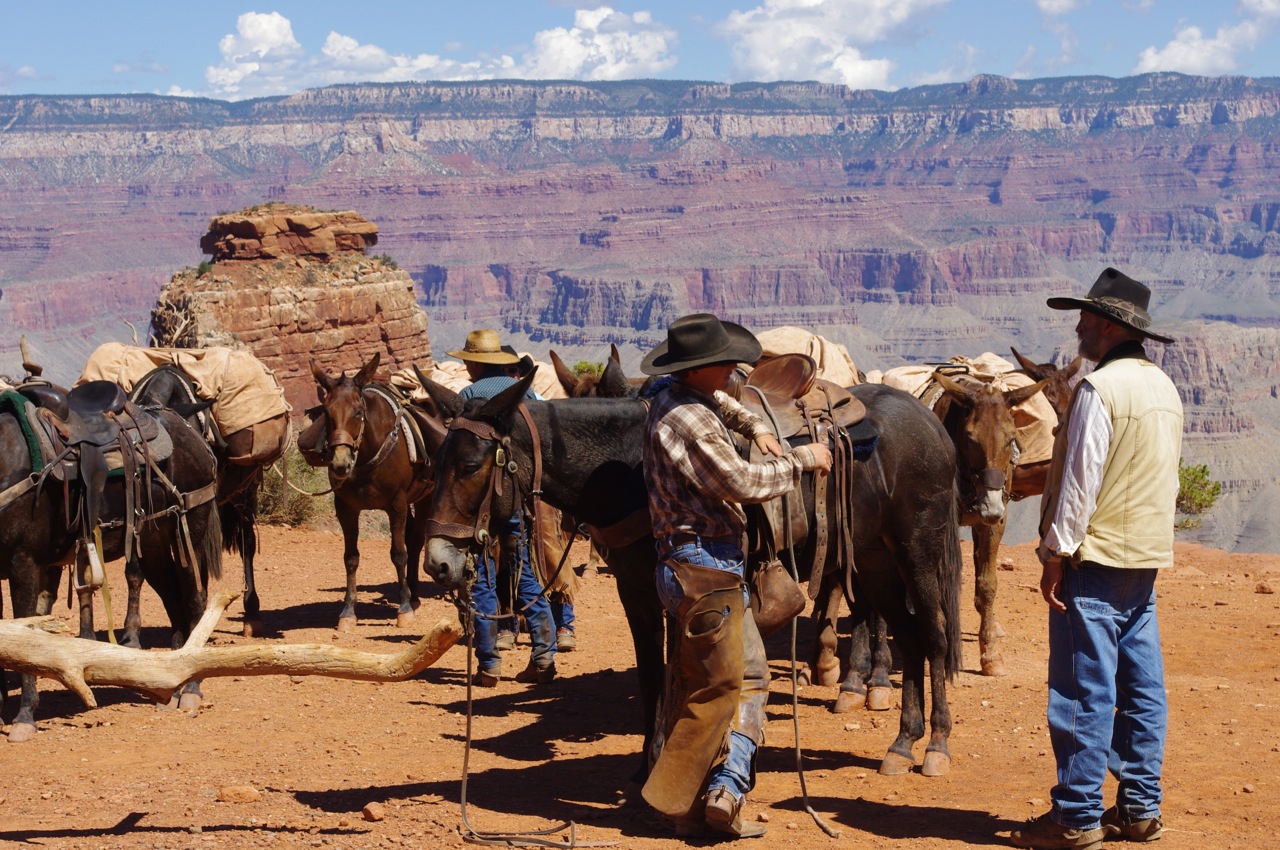 A group of cowboys lead their pack mules downward. The sight seemed to shoot me backward in time.